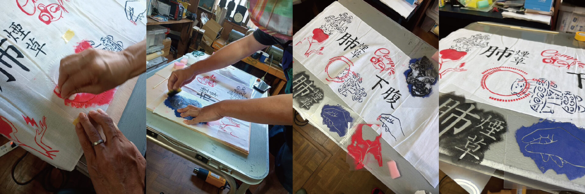 - てぬぐいにファクトリーザジ とcomputeの図柄をおすきにステンシルプリントします。