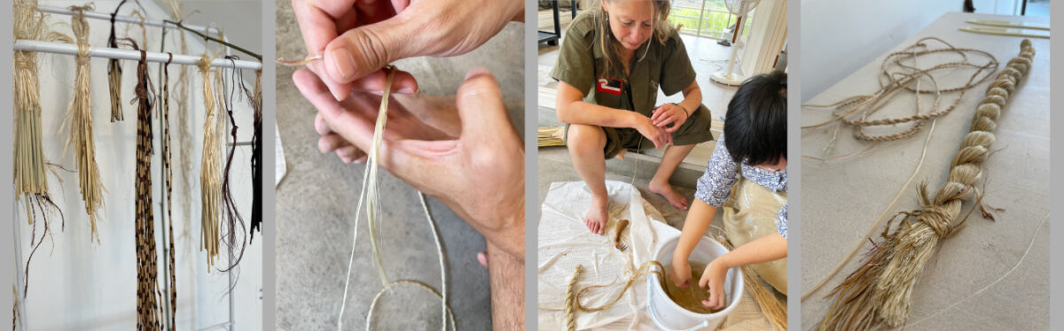 本多工房での展示では、アオテアロアNZから持参した織物やケテ・クペンガ(あみかご)、旅の途中で撮った写真などを展示しましたが、中でも日本滞在期間に集めた収集物が重要な部分を占めていました。滞在中は、ムカやハラケケ(亜麻)といった加工済みの繊維を使って、ワナンガ(ワークショップ)を実施することができました。